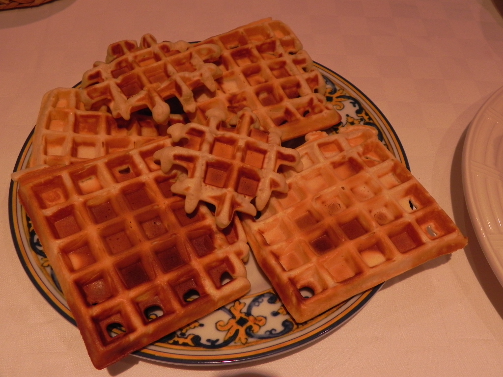 Aquecer bem a máquina das waffles e deitar-lhe uma concha de massa, a qual deve ser bem espalhada. Fechar bem e deixar cozer durante mais ou menos 5 minutos. Retirar os waffles e colocá-lo sobre uma grelha para ganhar consistência estaladiça.