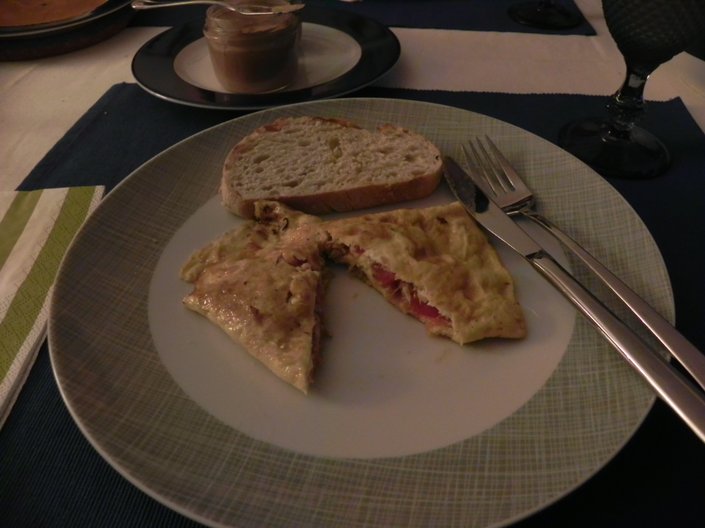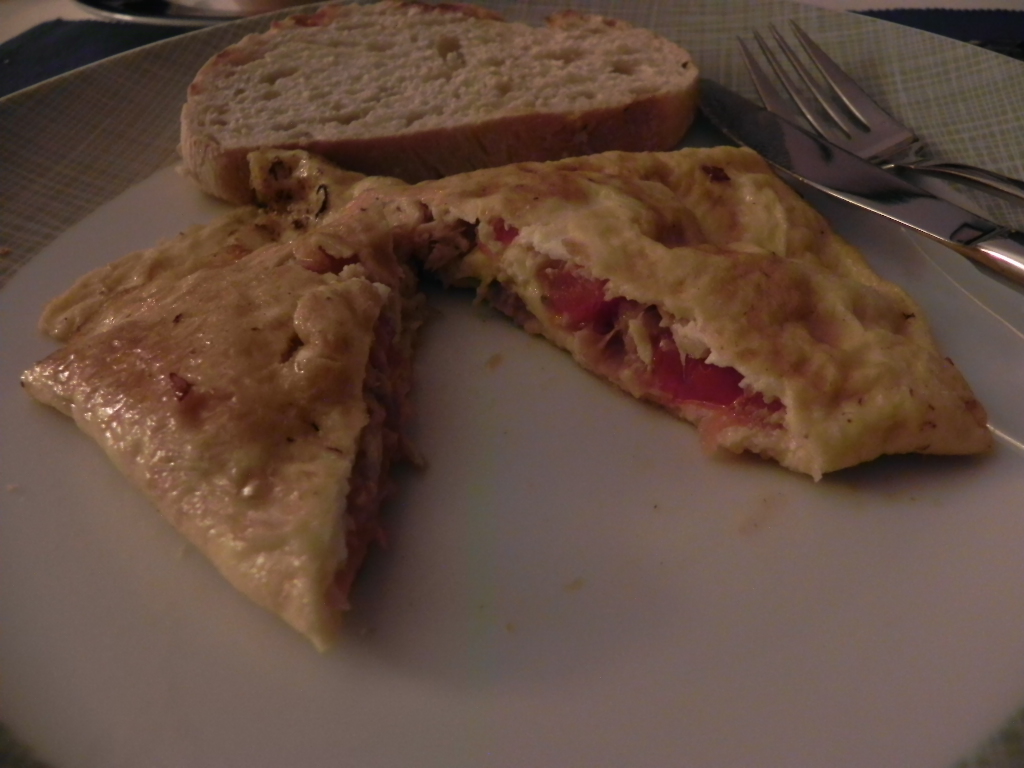 Levar um tacho ao lume com um pouco de óleo e quando estiver quente adicionar os ovos (optou por fazer pequenas omeletes), deixar que os ovos endureçam um pouco e adicionar a mistura de tomate e atum. Com cuidado dobrar as omeletes.